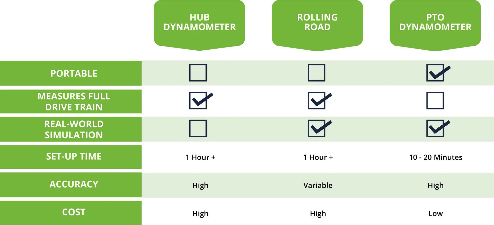 - PTO dynamometers are ideal for quick checks and PTO-specific performance.